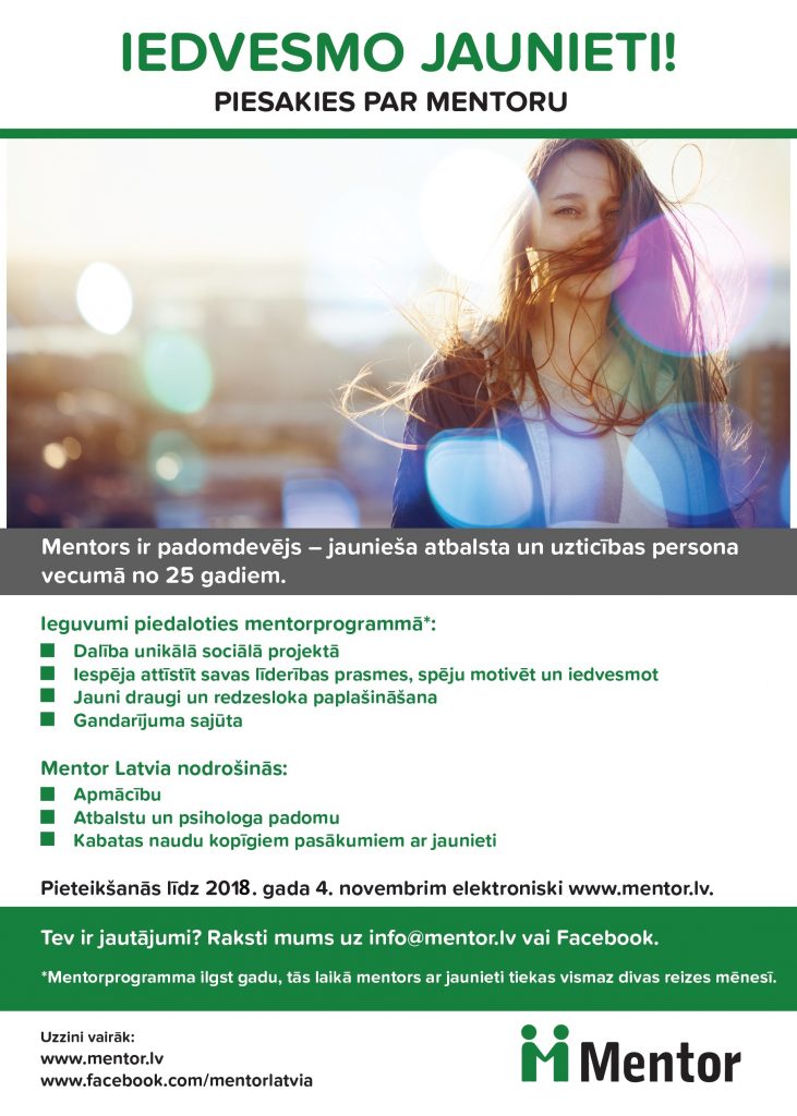 Ja esi vecumā no 25 gadiem un vēlies iedvesmot jaunieti, piesakies par mentoru, aizpildot PIETEIKUMA ANKETU līdz 2018. gada 4. novembrim!