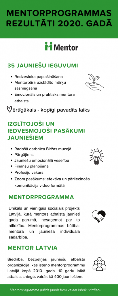 Patiecoties šim atbalstam, mēs varējām palīdzēt jauniešiem, kuriem tas visvairāk ir nepieciešams. 2020. gadā atbalstu saņēma 35 jaunieši, kuriem pietrūkst ģimenes rūpju. Mentorprogrammā jaunieši saņem ne tikai individuālu mentora atbalstu un uzmanību, bet arī iespēju piedalīties Mentor Latvia rīkotajos izglītojošos pasākumos par viņiem aktuālām tēmām (budžeta plānošana, attiecību veidošana, emocionālā labsajūta u.c.).