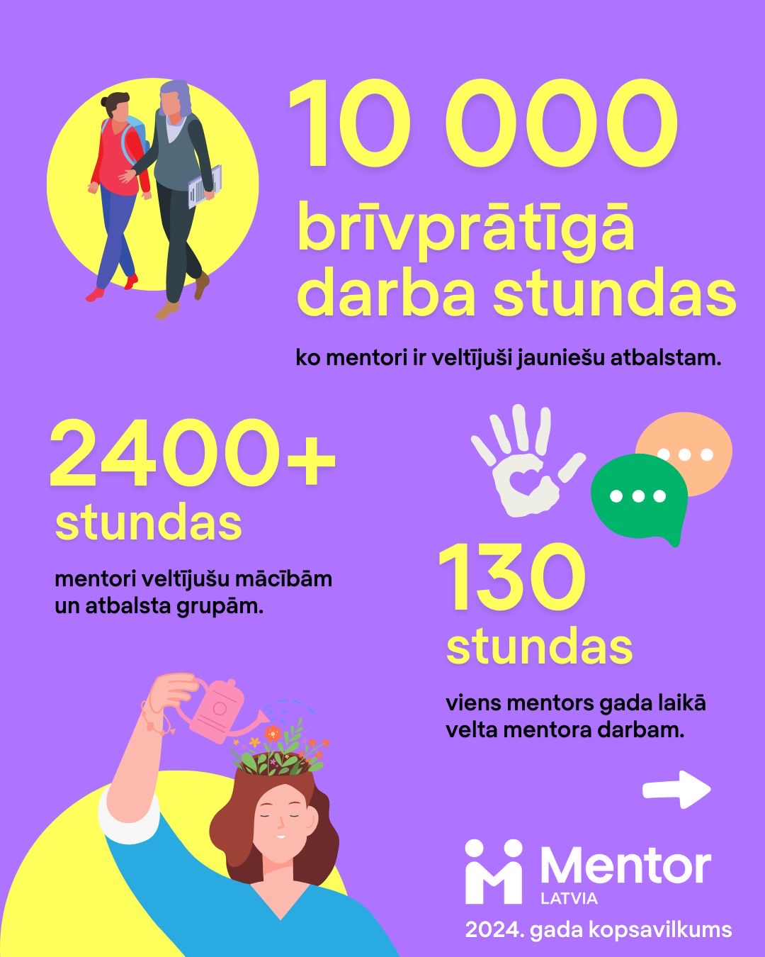 - 10 000 mentoru brīvprātīgā darba stundas, kuras mentori ir veltījuši jauniešu atbalstam.