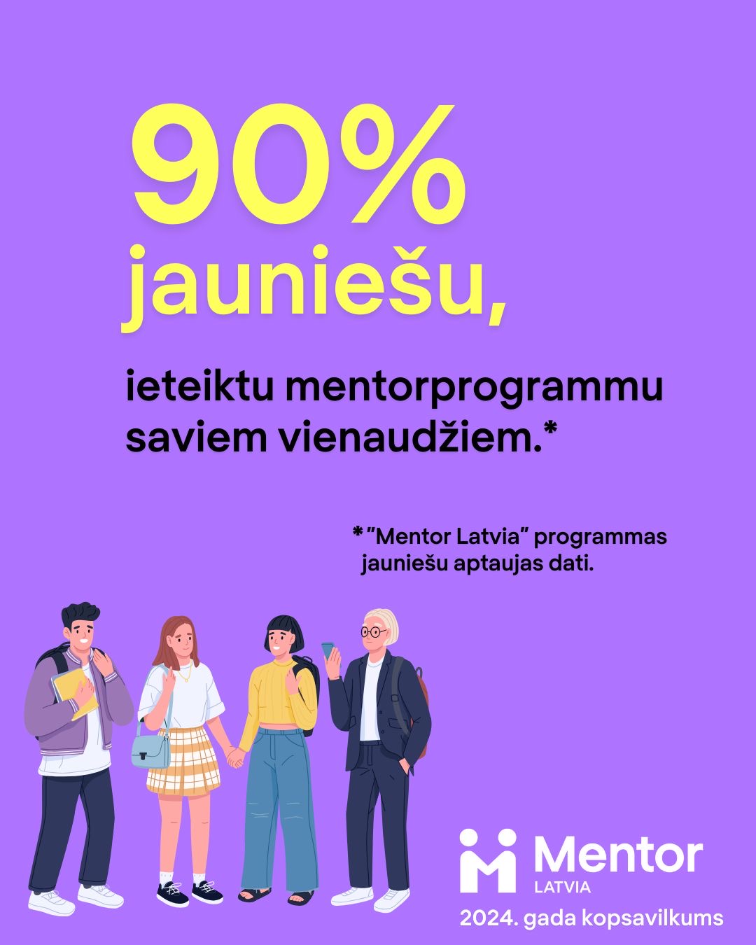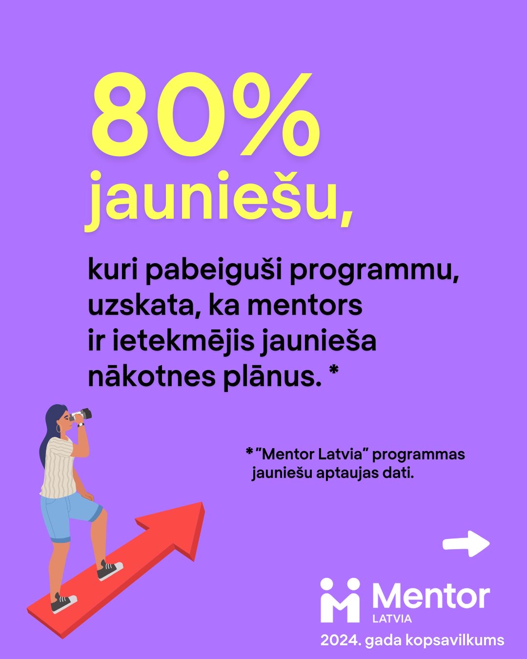 2024.gadā pateicoties atbalstītājiem, individuālajiem ziedotājiem un Dod 5 akcijai, 84 jaunieši ir satikuši savu mentoru un saņēmuši atbalstu. Programma tiek īstenota, pateicoties ziedotāju un sadarbības partneru atbalstam. Bez šiem ziedojumiem nebūtu iespējams nodrošināt nepieciešamo atbalstu jauniešiem.