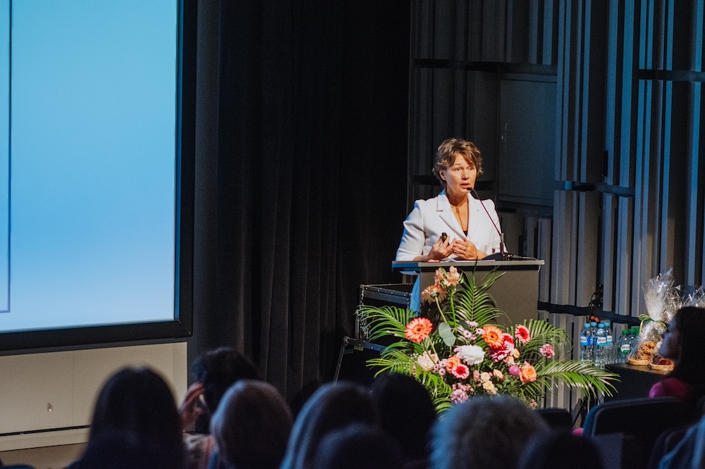 "Mentor Latvia" izpilddirektore Edīte Zvirbule konferencē Siguldā stāsta par mentoringa nozīmi mazāk aizsargātu jauniešu ikdienā.